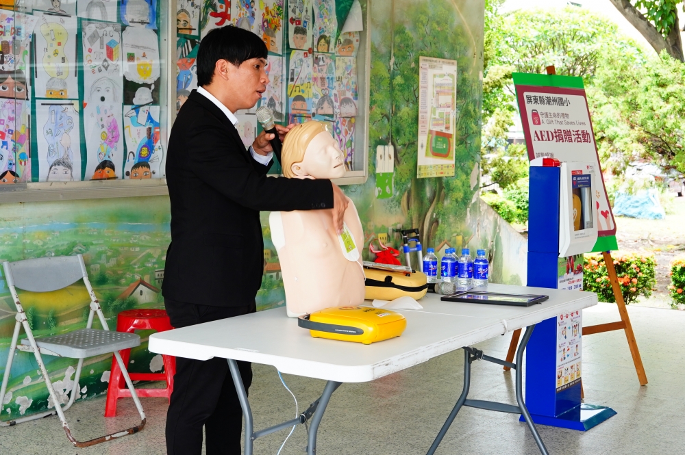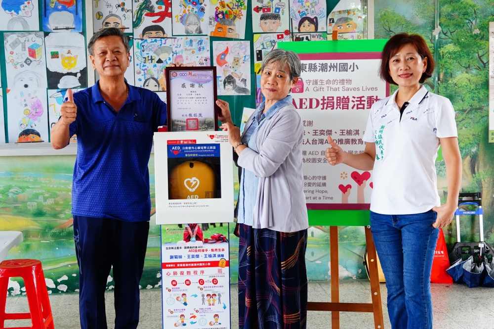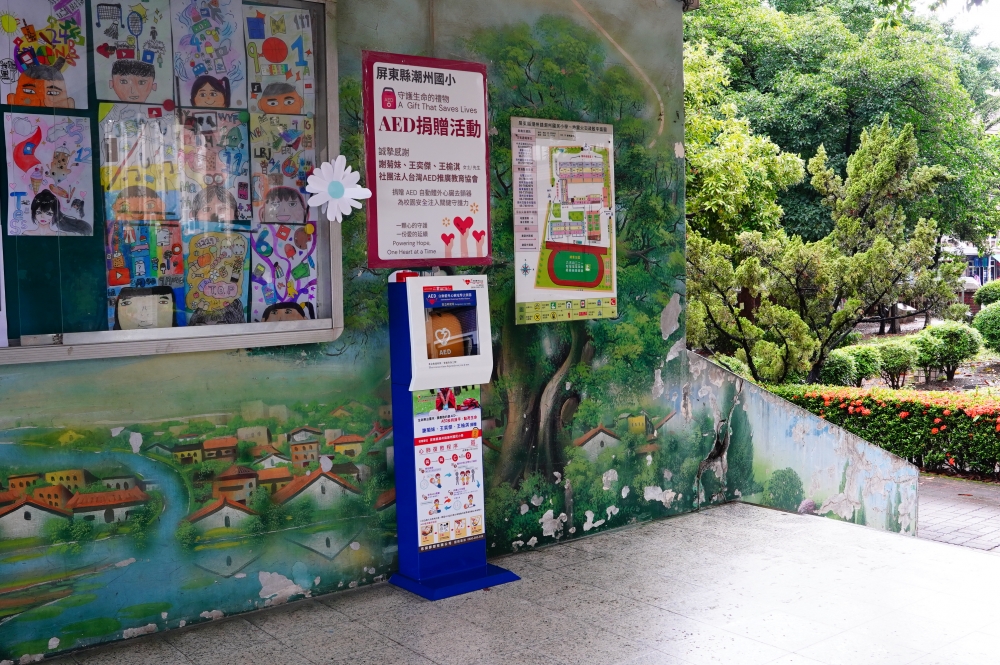 原本她計畫將AED捐贈至小琉球,但考量母親舟車勞頓的辛苦,最後決定將這份心意回饋給母校──潮州國小。廖小姐還親自前往勘查,發現校內原有的AED設置於健康中心,但平日有許多居民會到學校操場休閒、運動,其中多為長者,生命風險相對較高,因此她貼心地建議於司令台後方或旁側增設一台AED。