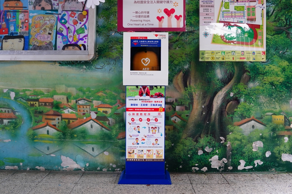 經協會與學校多方討論後,最終決議將AED設置在操場旁的穿堂中。這個地點不僅能妥善保護AED設備,也能確保師生與前來運動的民眾,在緊急時刻能迅速取得、守護生命。