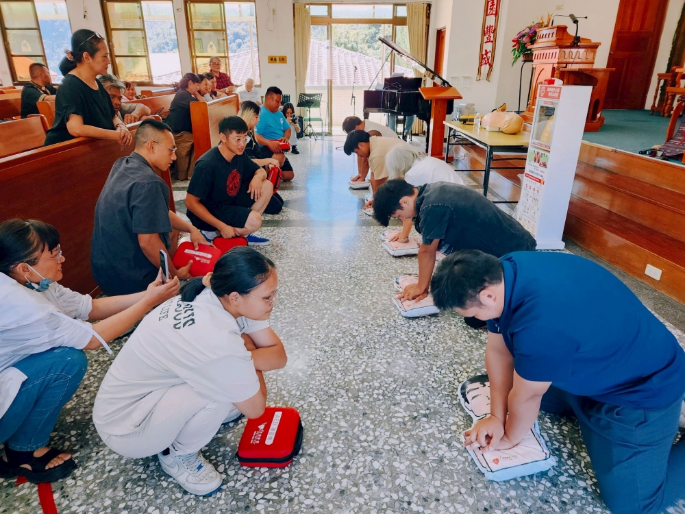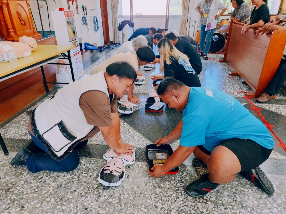除了設備的捐贈,我們也由吳老師帶領部落居民與教會信徒,一同學習 CPR 與 AED 的急救知識。 看著長輩們專注操作、渴望學會救人技能的眼神,我們深深感受到—— 這不只是一台機器,更是一份「為家人多爭取一次機會」的力量。