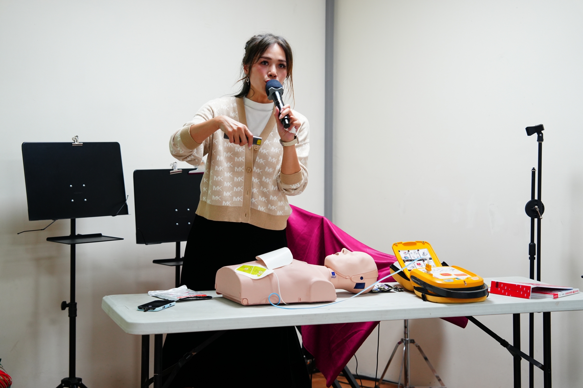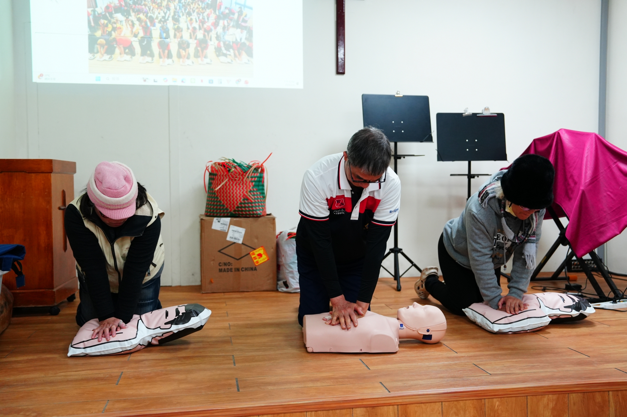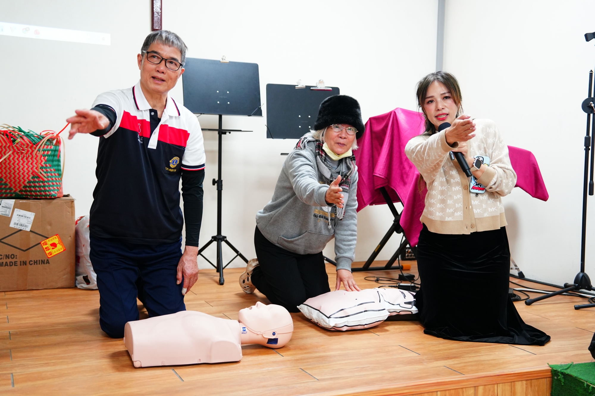 為了確保這份愛心能發揮最大效益,我們也安排了老師進行專業教學。陸老師深入淺出的講解,讓原本看似專業、困難的急救流程變得簡單易懂,不僅長輩能學會,連兒童都能輕鬆上手,這樣的教學打破了年齡限制,讓每個人都有能力在關鍵時刻挽回寶貴的生命。
